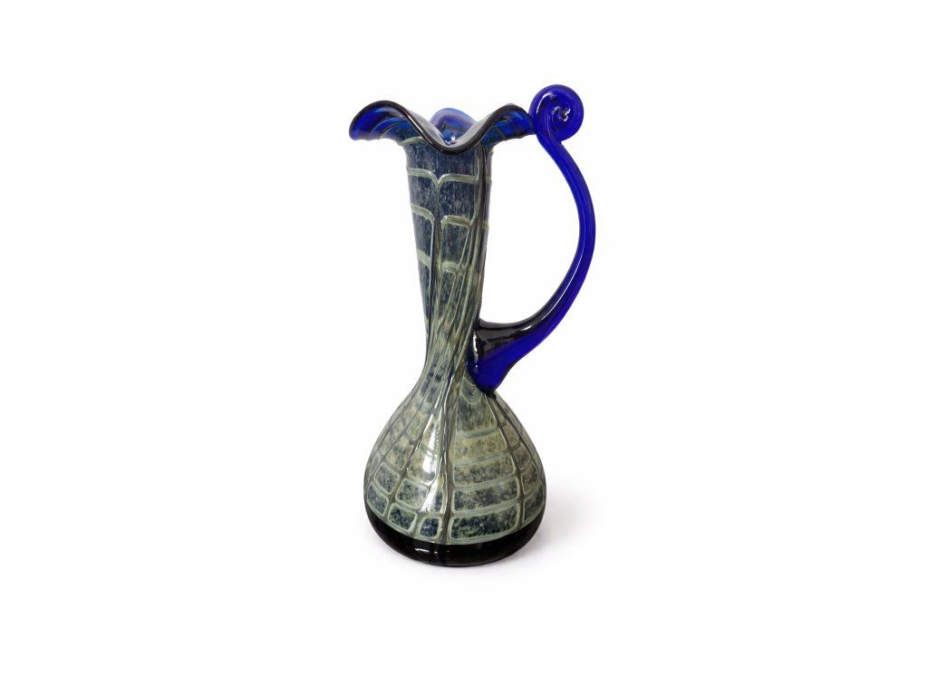 Nádherný dizajnový džbán z ručně foukaného irisovaného skla s niťovými nálepy ve stylu Art Noveau dle autorského návrhu Jana Zemana, Nový Bor, 90. léta 20. století. Výška 19 cm. 100% TOP stav.
