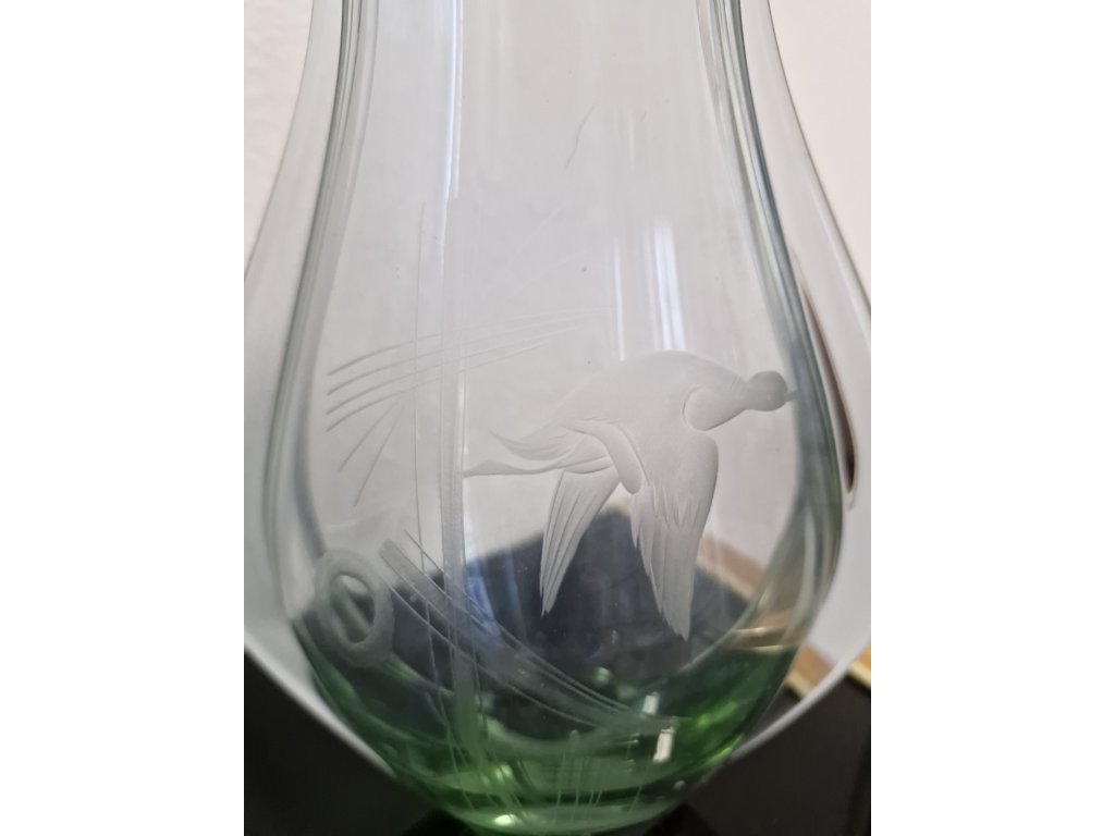 Krásná váza z alexandritového hutního skla s rytinou letící kachny dle autorského návrhu Miloslava Klingera, sklárna ŽBS, 60. léta 20. století. Výška 20 cm.Top stav. První a druhá foto je pořízena při neonovém osvětlení, proto je sklovina zelená. Při běžném světle je sklovina fialová.