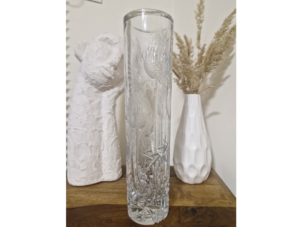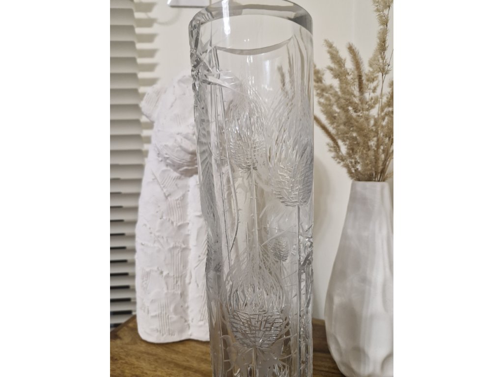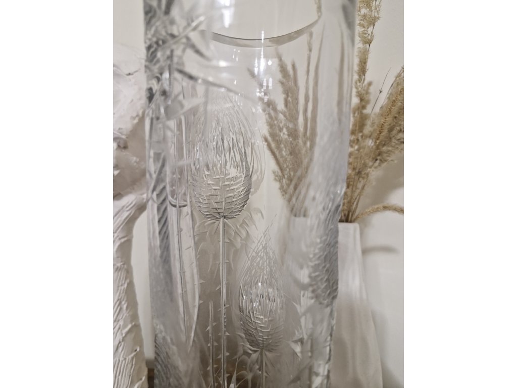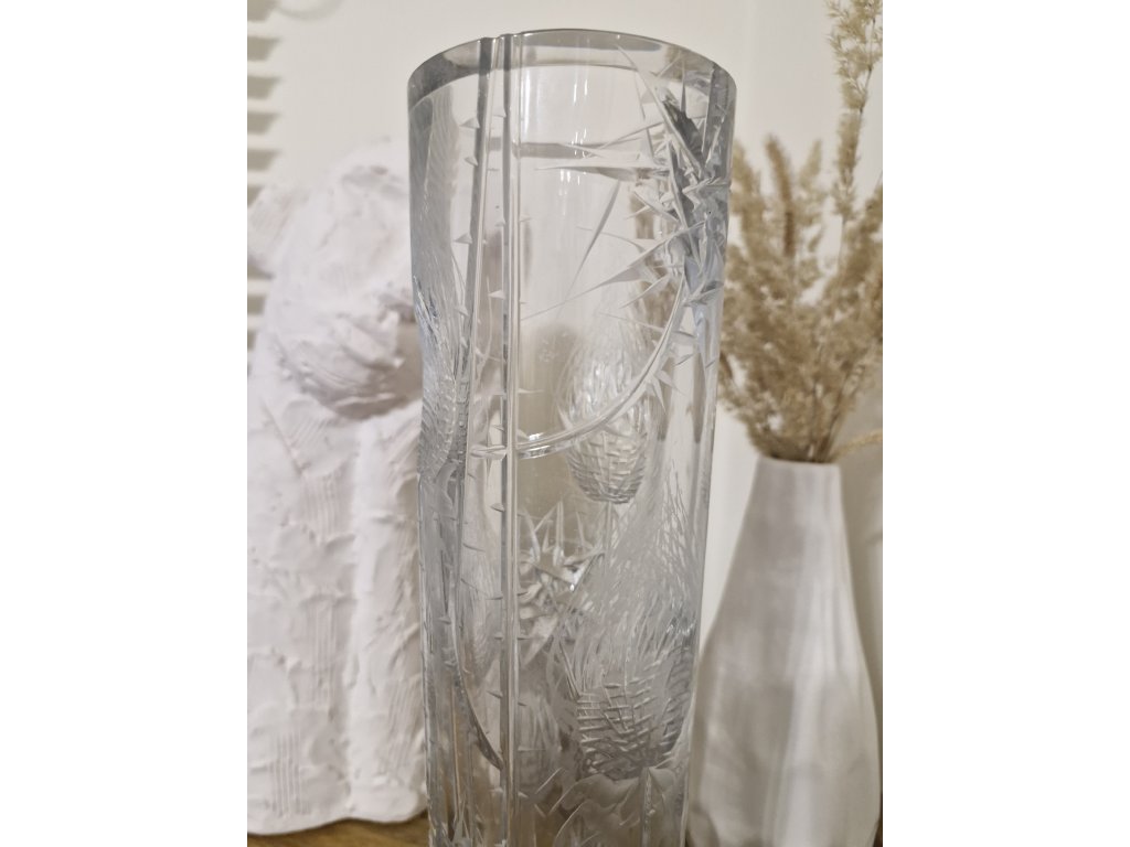 Nádherná váza z broušeného skla - plastický motiv bodláků. Autor Josef Švarc, sklárna Josefodol. Výška 35,5 cm. Top stav.