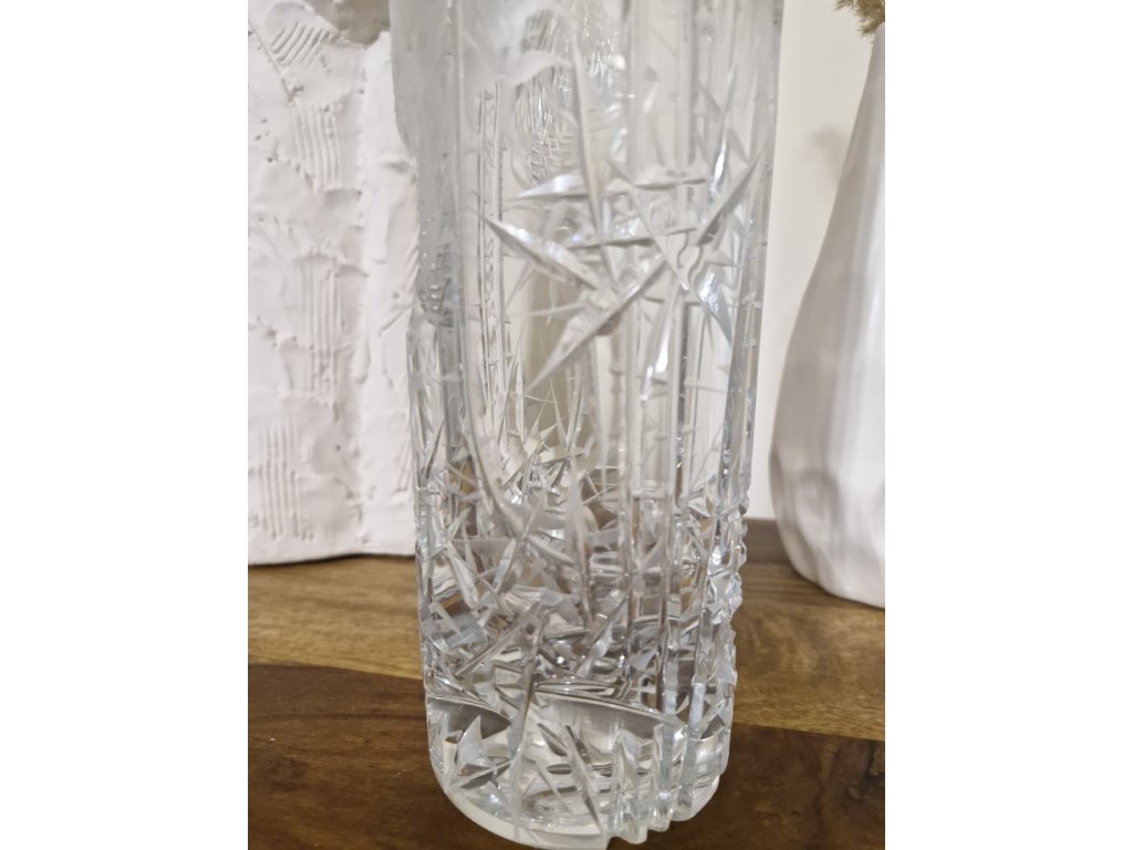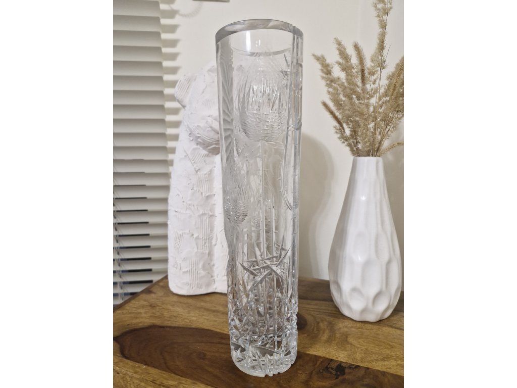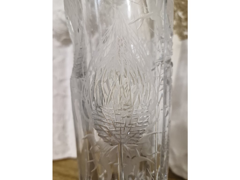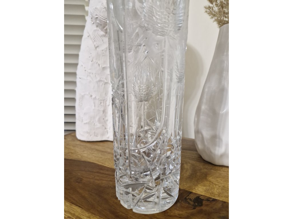 Nádherná váza z broušeného skla - plastický motiv bodláků. Autor Josef Švarc, sklárna Josefodol. Výška 35,5 cm. Top stav.