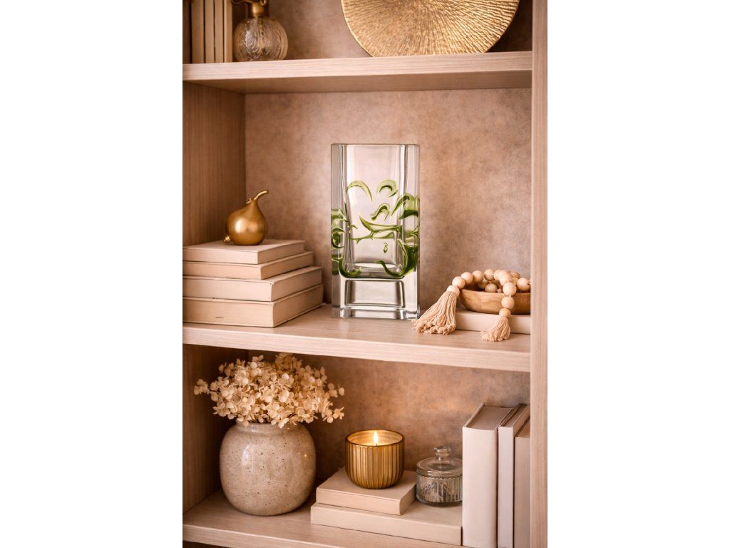 Luxusní váza z broušeného skla s přetvarovanými nálepy v jemně zelené barvě. Autor návrhu Ladislav Oliva, sklárna EXBOR, r. 1974. Výška 16 cm, podstava 9x17 cm. Top stav, na podtsavě několik mikro škrábanečků.
