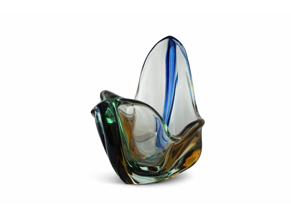 Méně vídaný tvar vázy z hutního skla s nálepy z kolekce RHAPSODY. Autor návrhu František Zemek, sklárna Mstišov, r. 1958. Výška 16 cm. Top stav.
