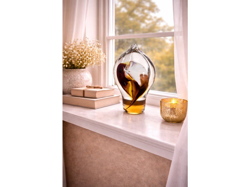 Krásná váza z hutního skla se zataveným barevným dekorem ve tvaru pavího oka. Z produkce VÚUS Nový Bor, 70. léta 20. století. Vzor č. 071/70. Výška 15 cm. Top stav.