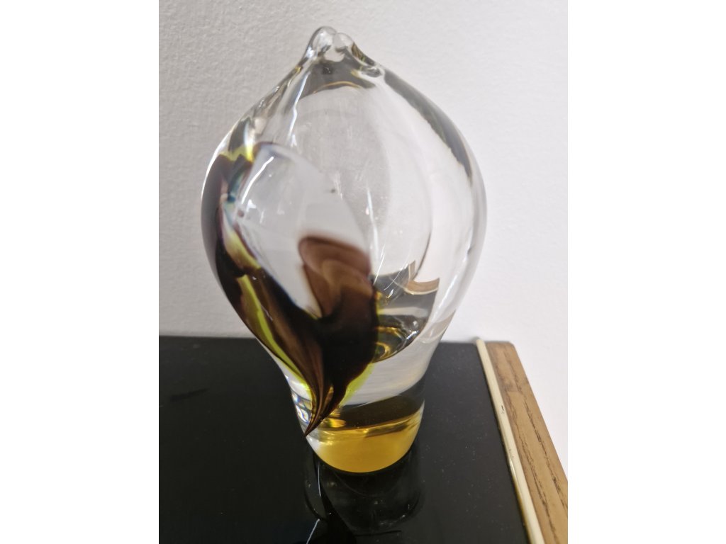 Krásná váza z hutního skla se zataveným barevným dekorem ve tvaru pavího pera. Autor návrhu Jiří Šuhájek, sklárna Crystalex Nový Bor, 70. léta 20. století. Výška 15 cm. Top stav.