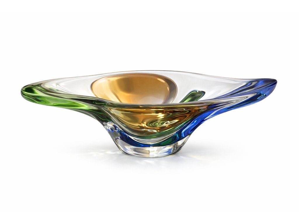 Nádherná velká mísa z hutního skla, kolekce RHAPSODY, autorský návrh František Zemek, sklárna Mstišov, r. 1958. Výška 12 cm, délka 37 cm. 100% TOP stav.