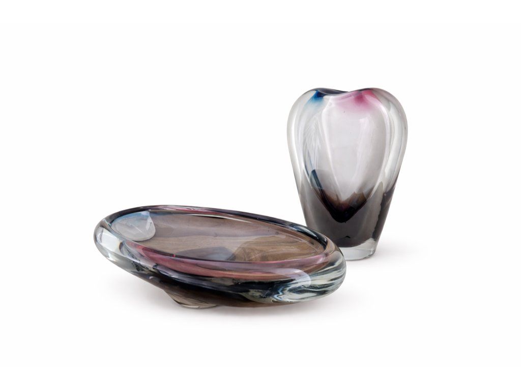 Vzácná sada z hutního skla dle autorského návrhu Františka Koudelky, sklárna Chřibská, r. 1963. Váza: výška 20 cm, 100% TOP stav Mísa: výška 8 cm, délka 25 cm, 100% TOP stav