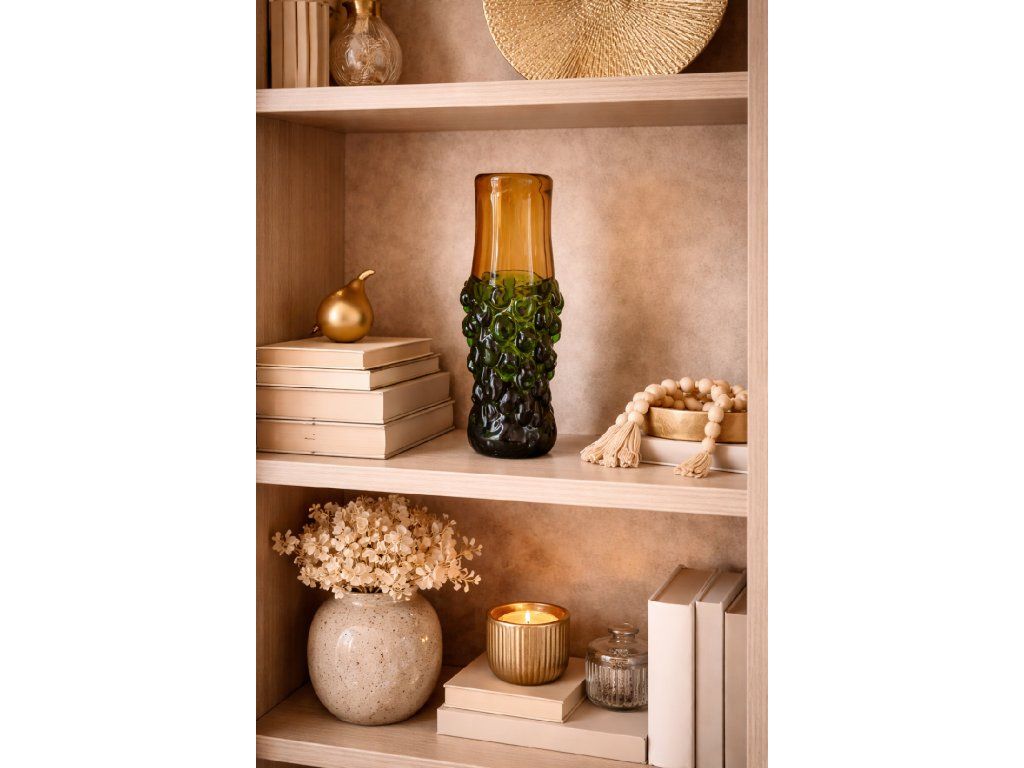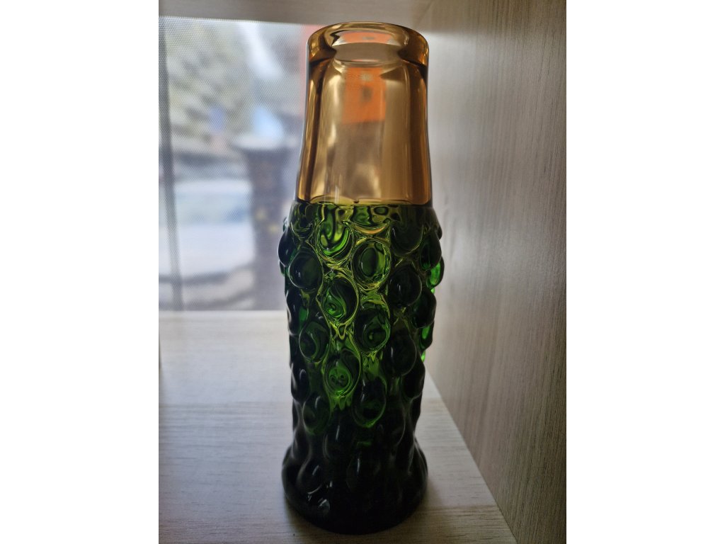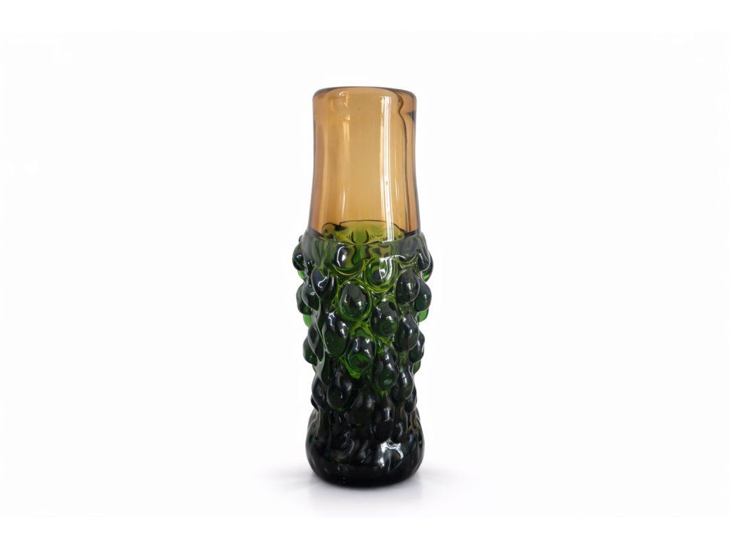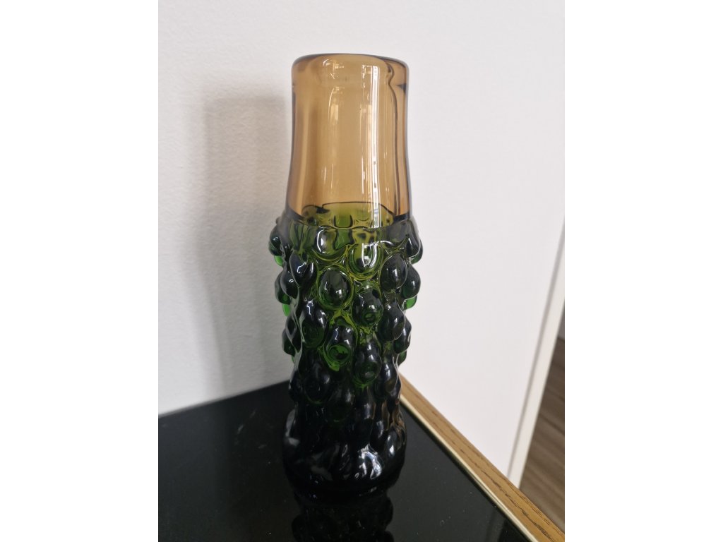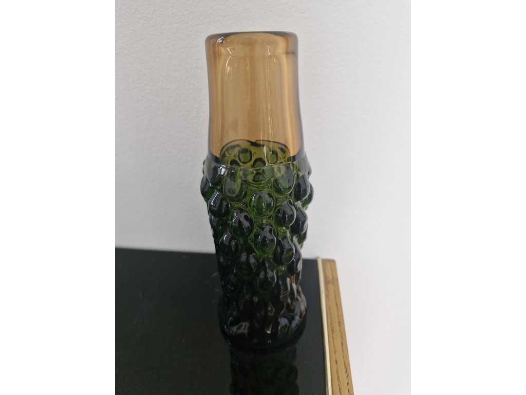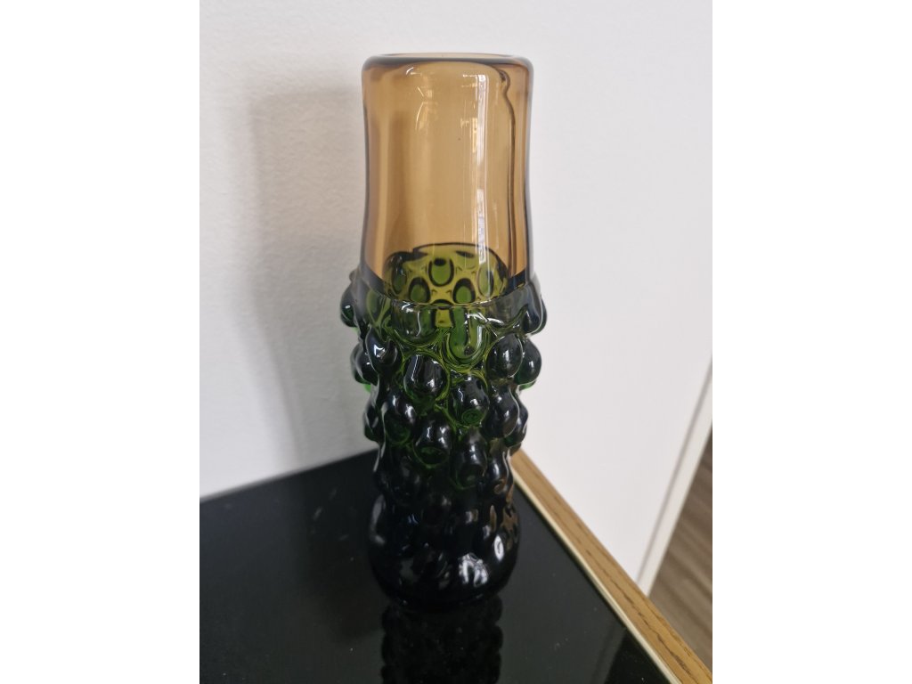 Nádherná váza z hutního skla s nálepy v krásné ambrovo - zelené barevné kombinaci. Autorský návrh Ladislav Paleček, sklárna Škrdlovice, r. 1976. Výška 24,5 cm. Top sběratelský stav.