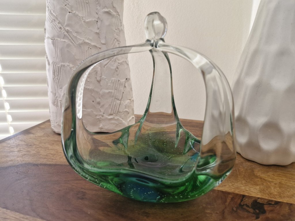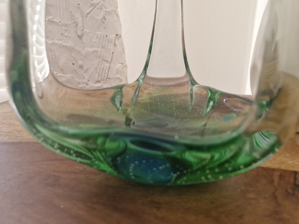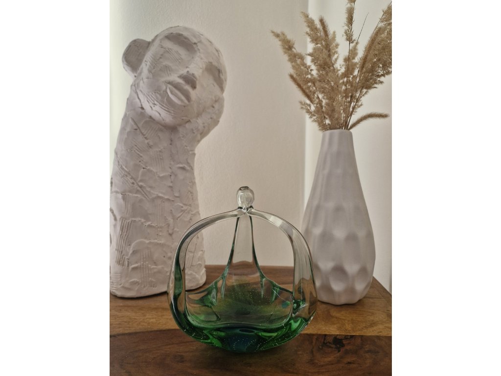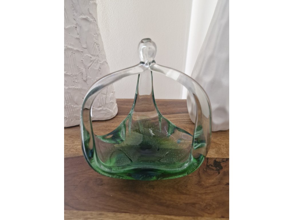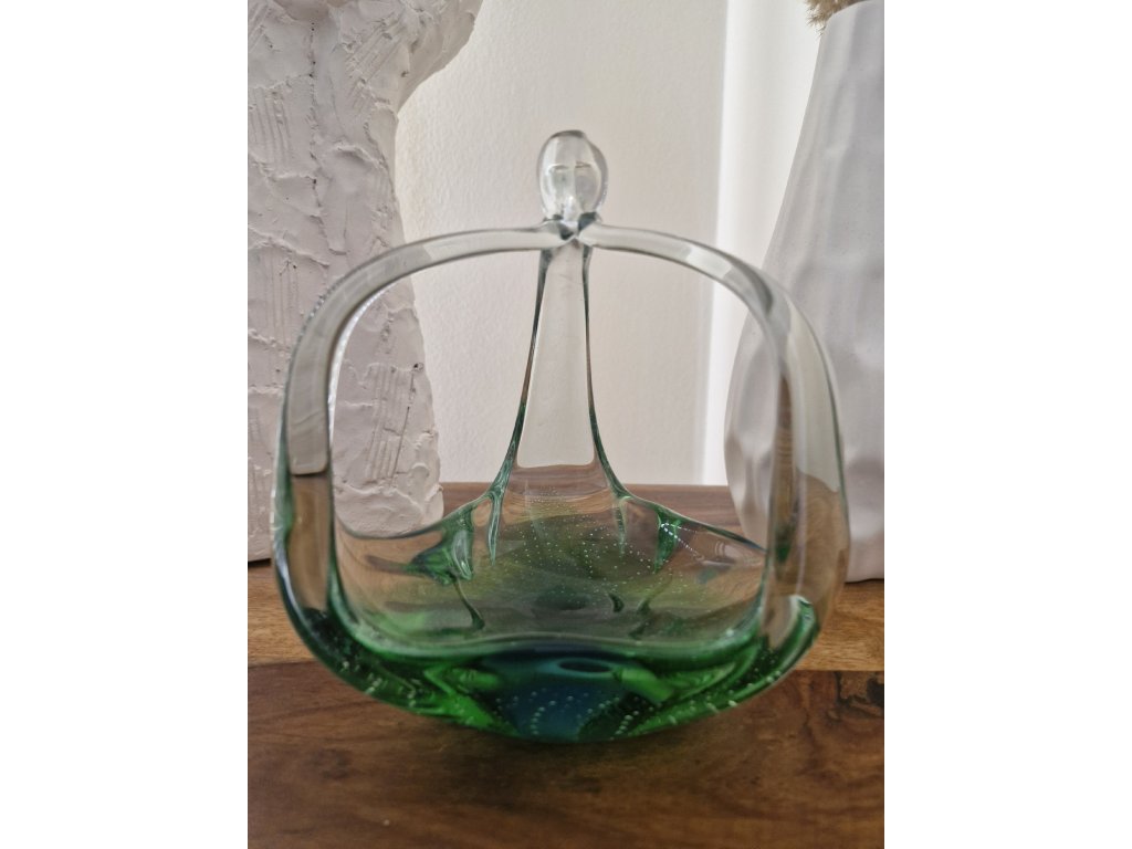 Vzácný košík z hutního skla v krásné modro zelené barevné kombinaci dolněn řízenými bublinkami ve spodní části. Autorský návrh František Zemek, sklárna Mstišov - Karlovarské sklo, r. 1960. Výška 18 cm. Top stav.