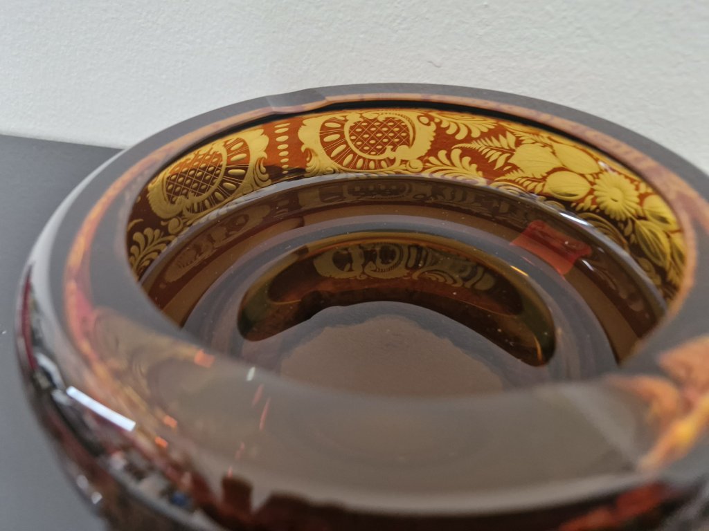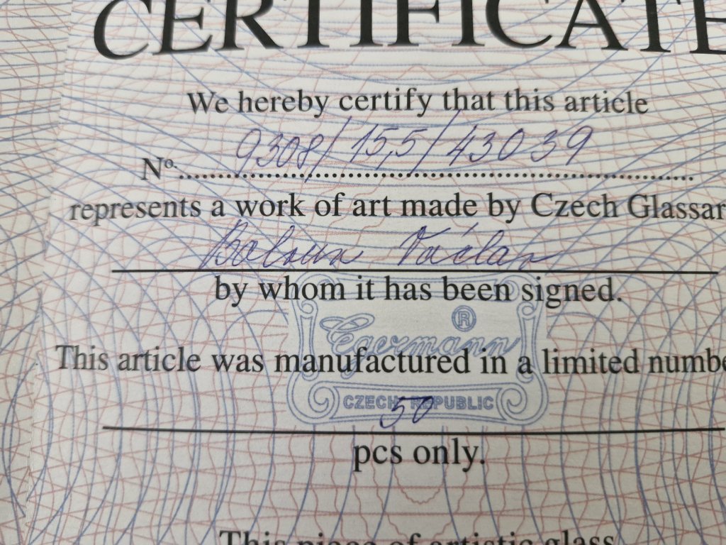 Nádherný popelník z hutního skla s originální rytinou z produkce sklárny Egermann, Nový Bor, r. 2011. Bylo vyrobeno pouze 50 kusů - každý kus je dílem jiného rytce. Každý popelník je dárkově balený a obsahuje certifikát s poradovým číslem a jménem rytce, který popelník ryl. Na certifikátu je rovněž podpis rytce a podpis tehdejšího ředitele sklárny Egermann. Výška 5 cm, průměr 15,5 cm. Top sběratelský stav.