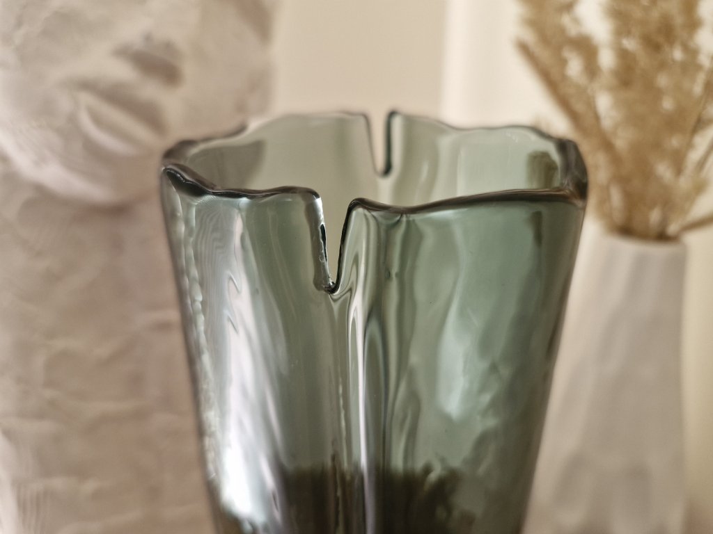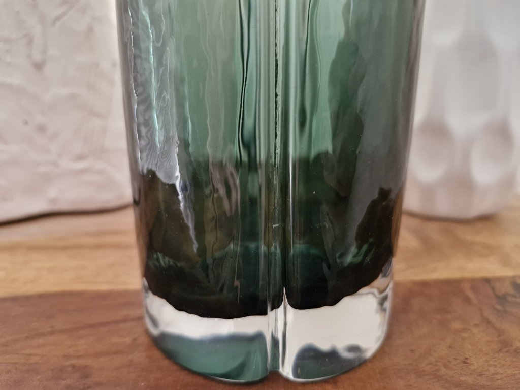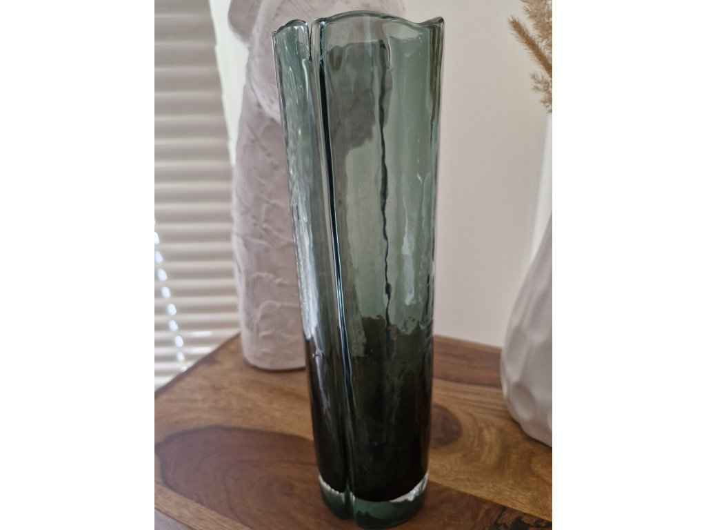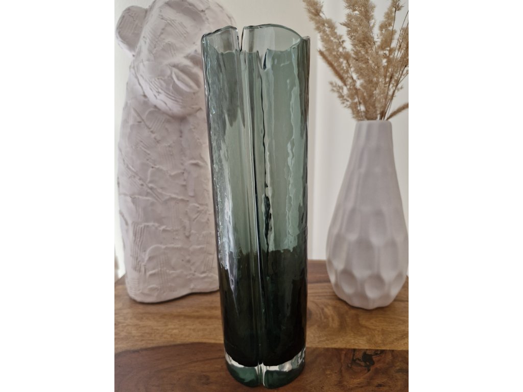 Originální váza z hutního skla v krásné kouřovo - zelené barvě se dvěmi symetrickými podélnymi zářezy po obou stranách. Z produkce Art Glass PRINC, Žďár nad Sázavou. Výška 29 cm. Top stav. Parádní kousek do moderního interiéru :)
