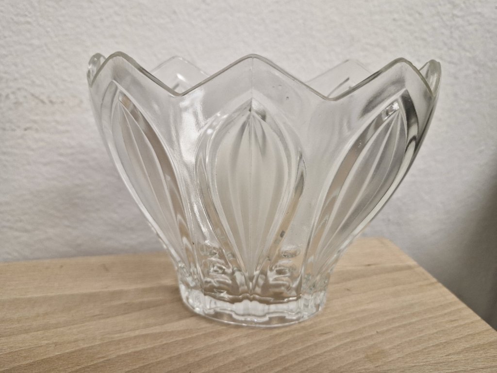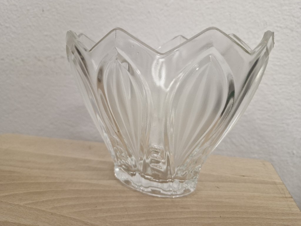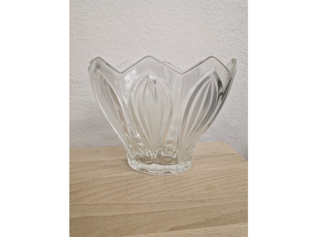 Elegantní žardinka z lisovaného skla dle autorského návrhu Rudolfa Schrotera, sklárna Rudolfova huť. Výška 14 cm, šířka 17 cm. Top stav.