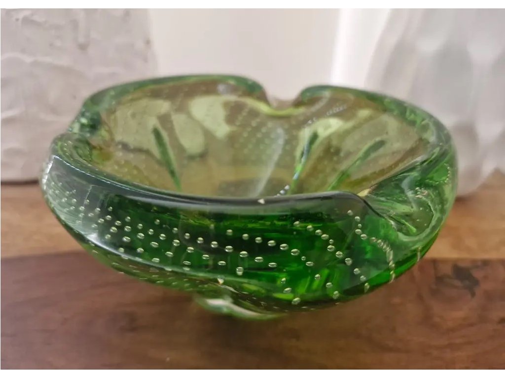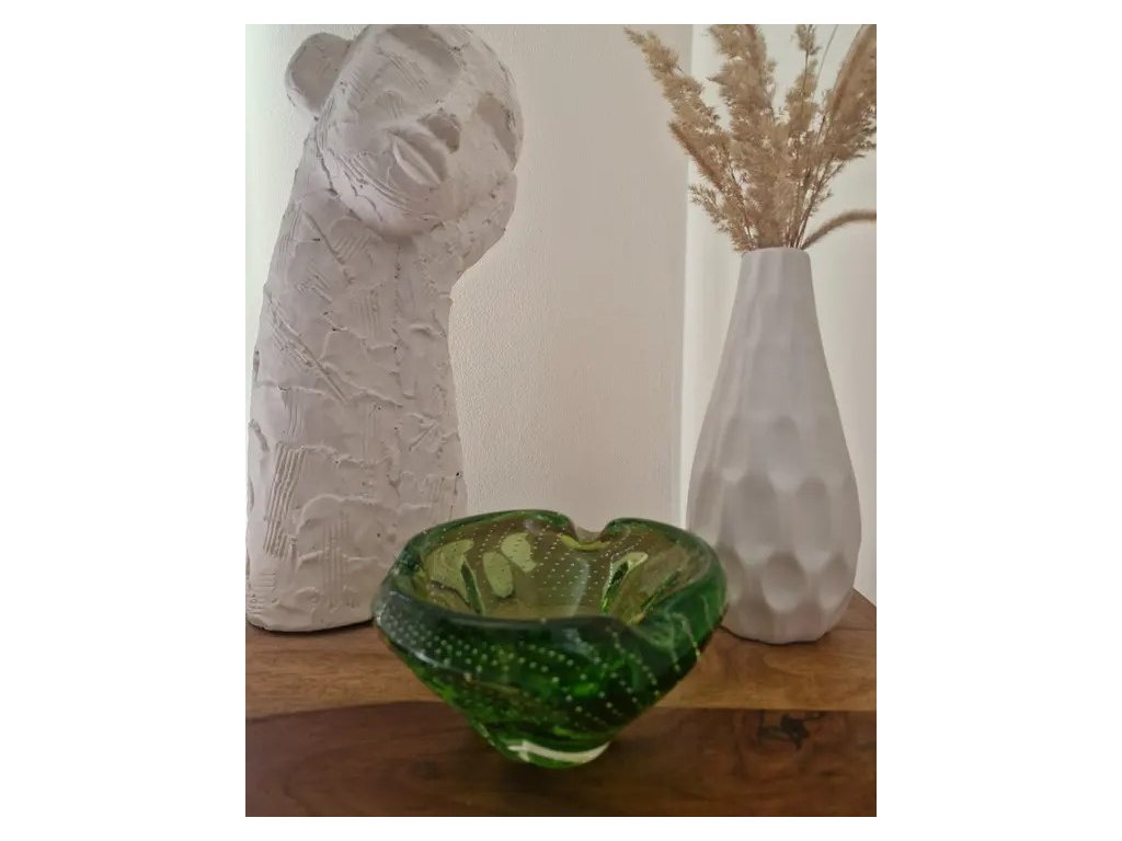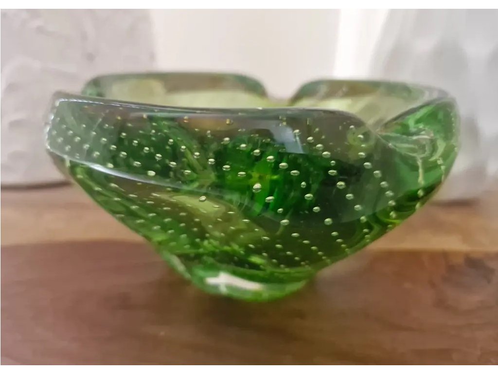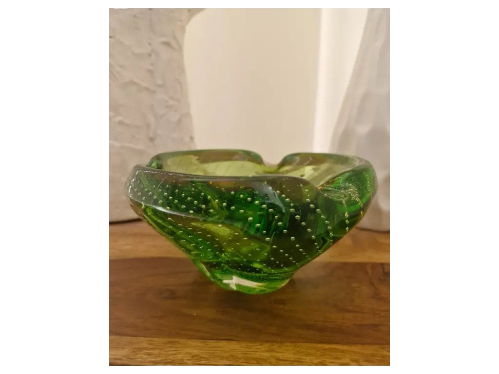 Krásná masivní mísa z hutního skla v krásné zelené barvě s dekorem řízených bublinek. Autor návrhu pravděpodobně František Zemek, sklárna Mstišov, 60. léta 20. století. Výška 8 cm, průměr 15 cm. Krásný stav, pouze na dně z vnitřní části několik malinkých černých teček.
