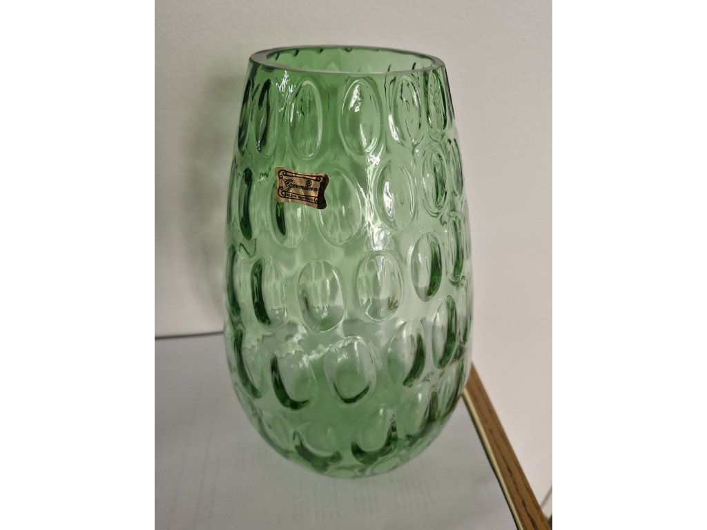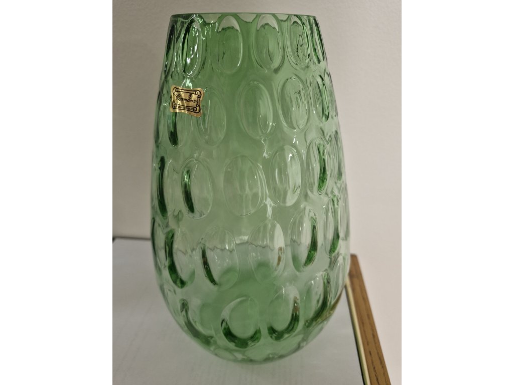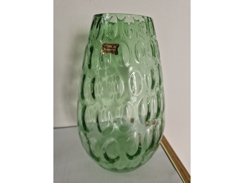 Nádherná zelená váza z foukaného skla ve vyšíí variantě s dekorem optických čoček dle původního návrhu Maxe Kannegiessera, kolekce NEMO. Provedla sklárna Egermann, Nový Bor, 2. pol. 20. století. Výška 26 cm. S původní nálepkou sklárny. Top stav nového zboží.