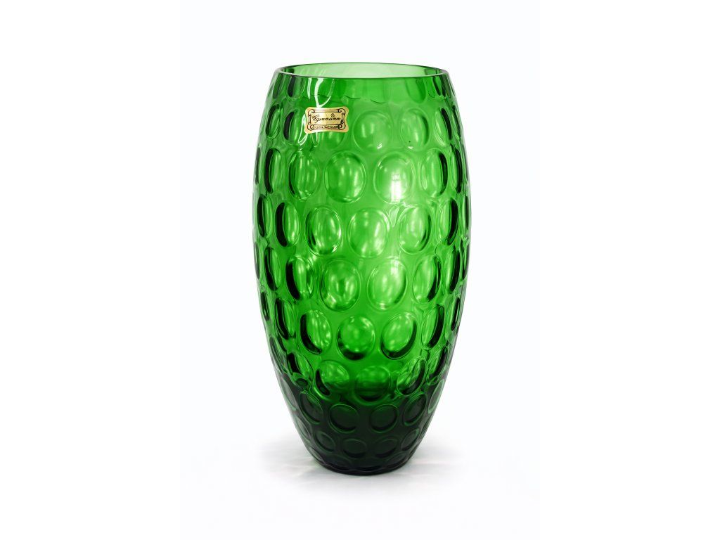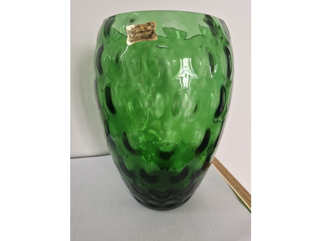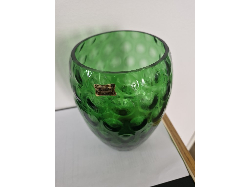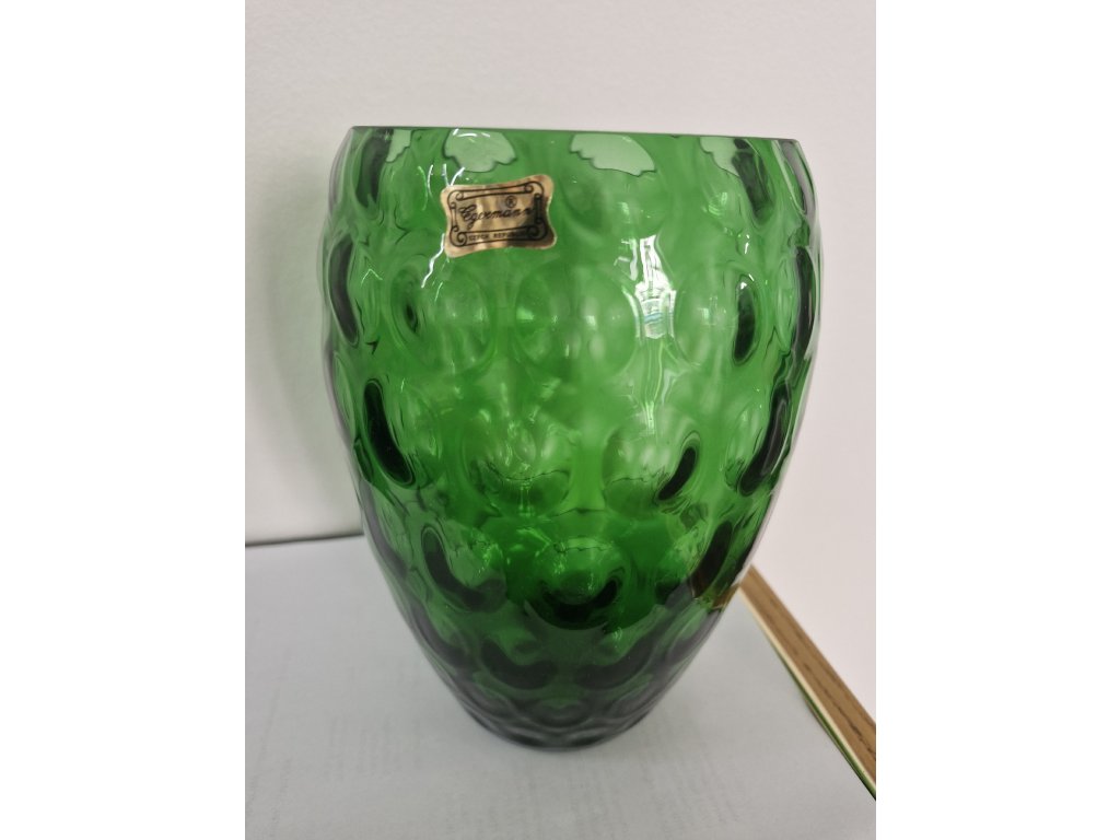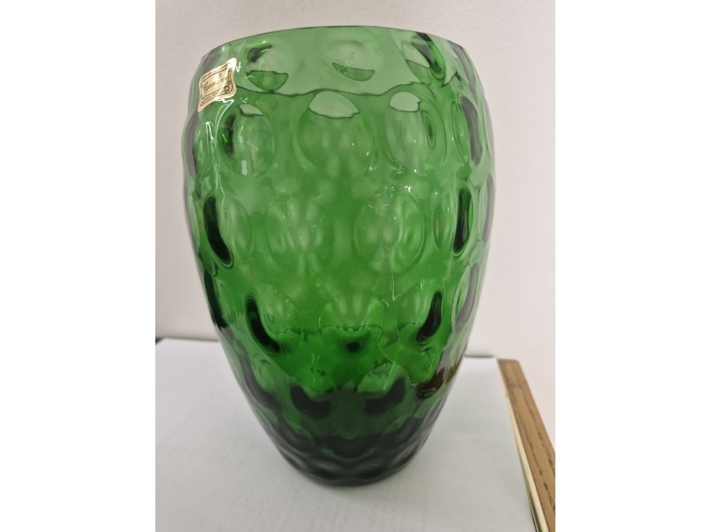 Nádherná zelená váza z foukaného skla s dekorem optických čoček dle původního návrhu Maxe Kannegiessera, kolekce NEMO. Provedla sklárna Egermann, Nový Bor, 2. pol. 20. století. Výška 22 cm. S původní nálepkou sklárny. Top stav nového zboží.