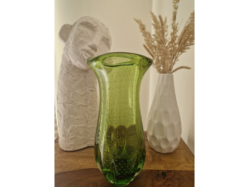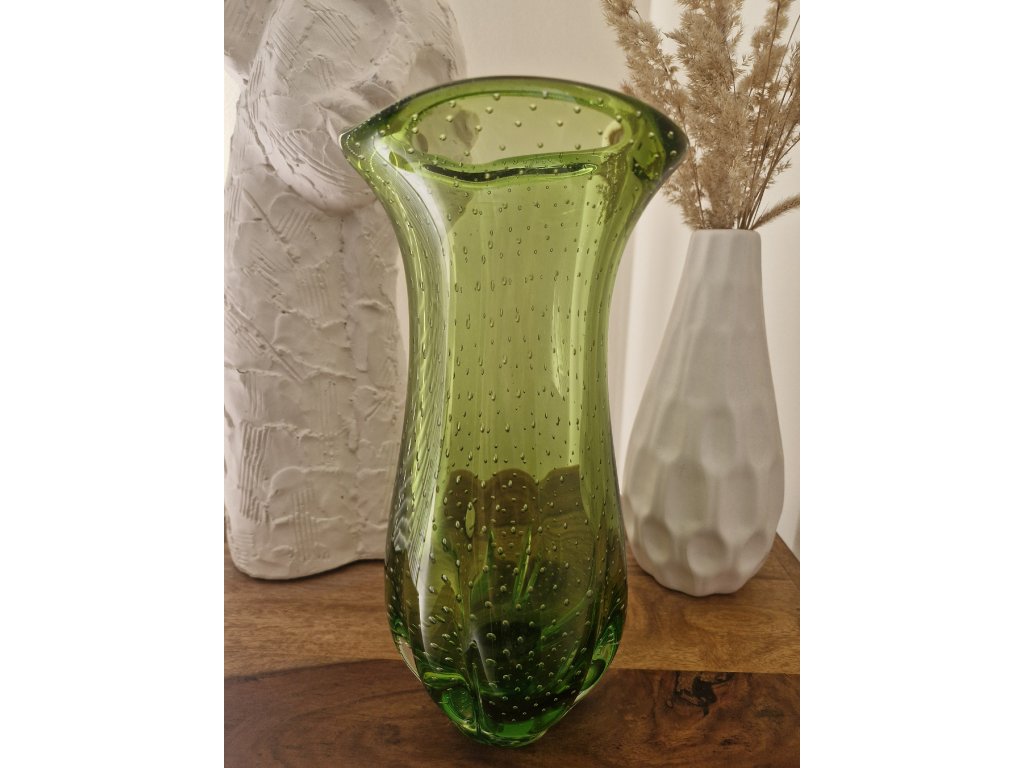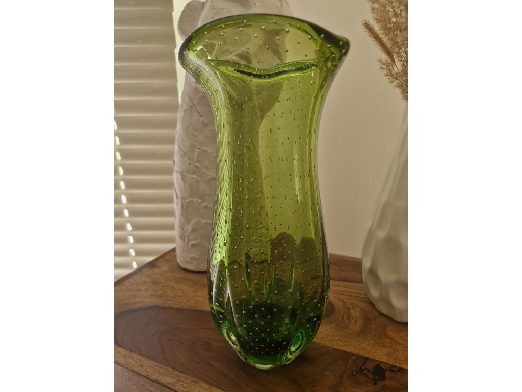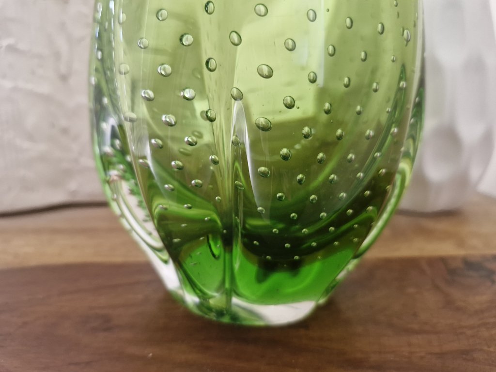 Krásná masivní váza z hutního skla v krásné zelené barvě s dekorem řízených bublinek. Autor návrhu pravděpodobně František Zemek, sklárna Mstišov, 60. léta 20. století. Výška 28 cm. Top stav.