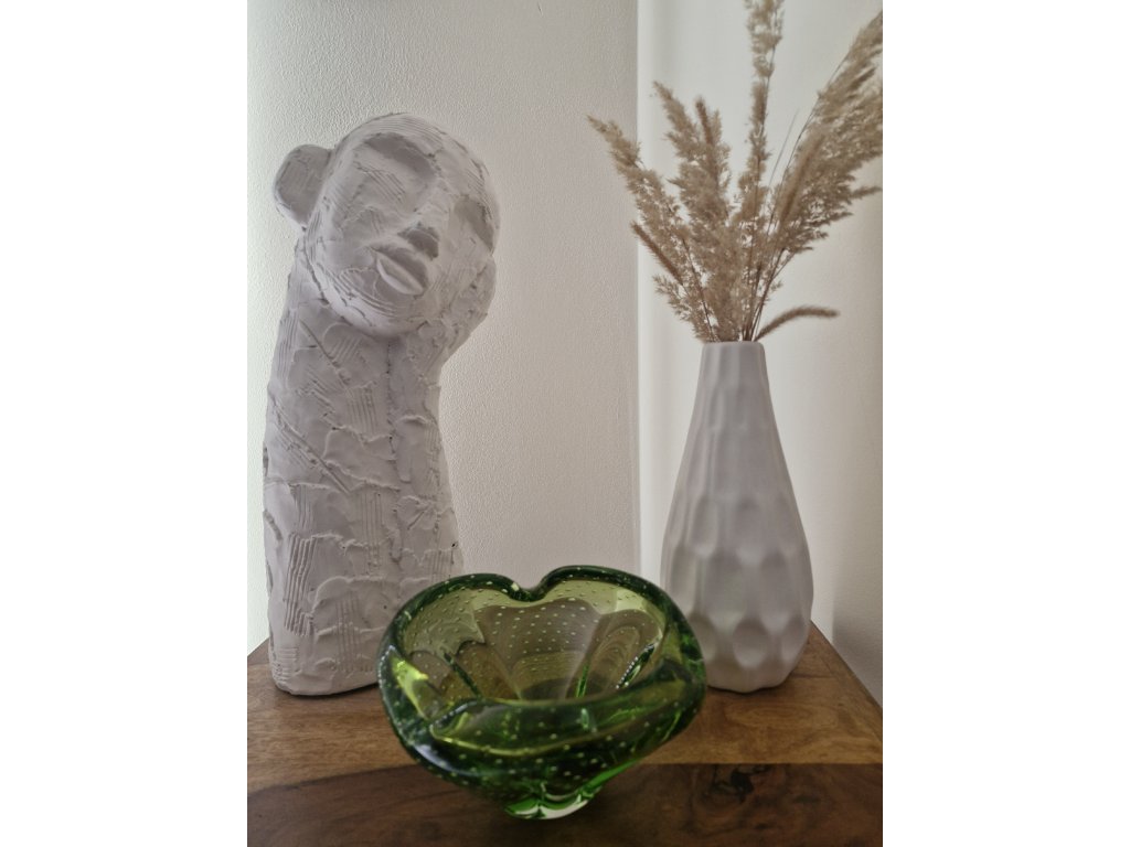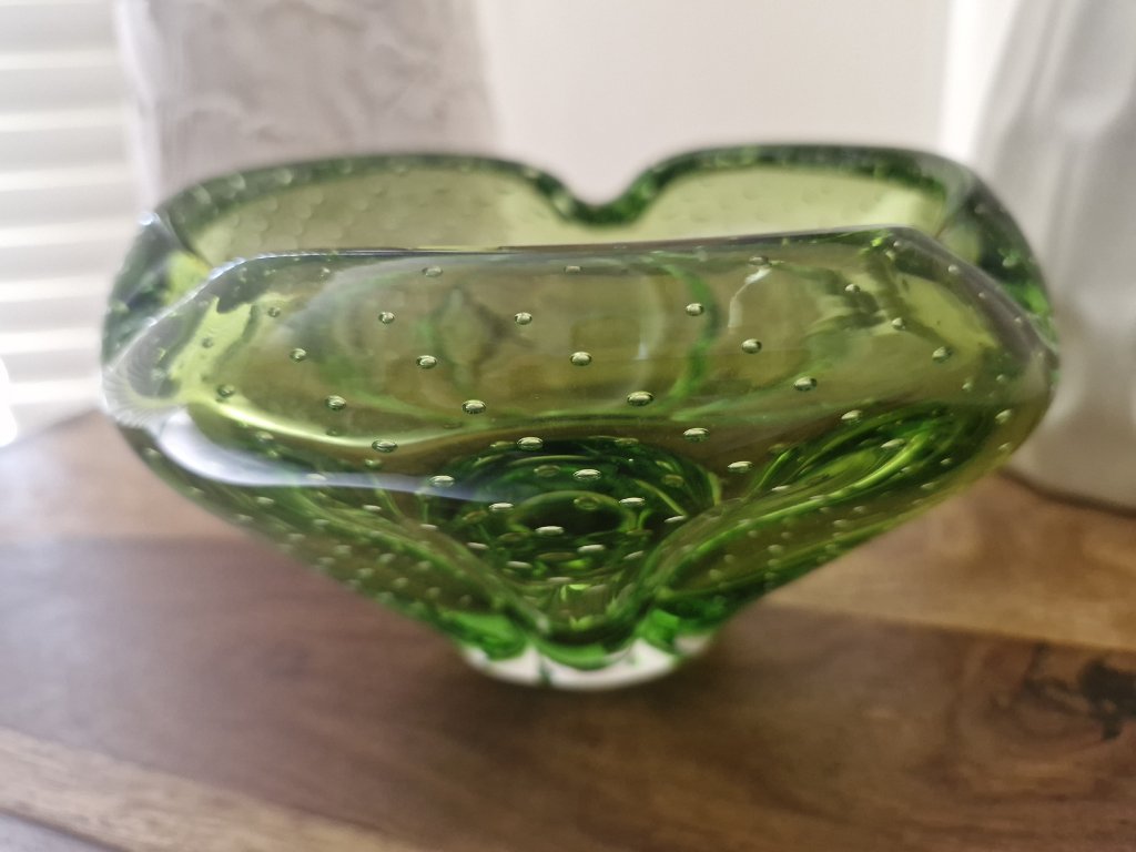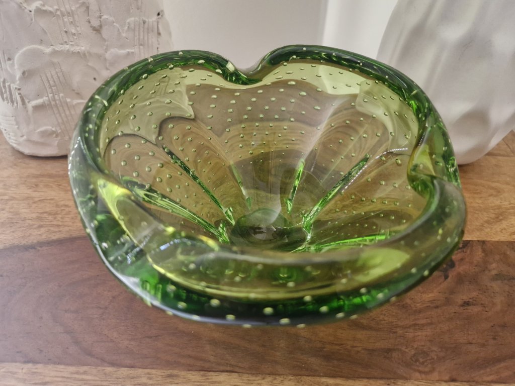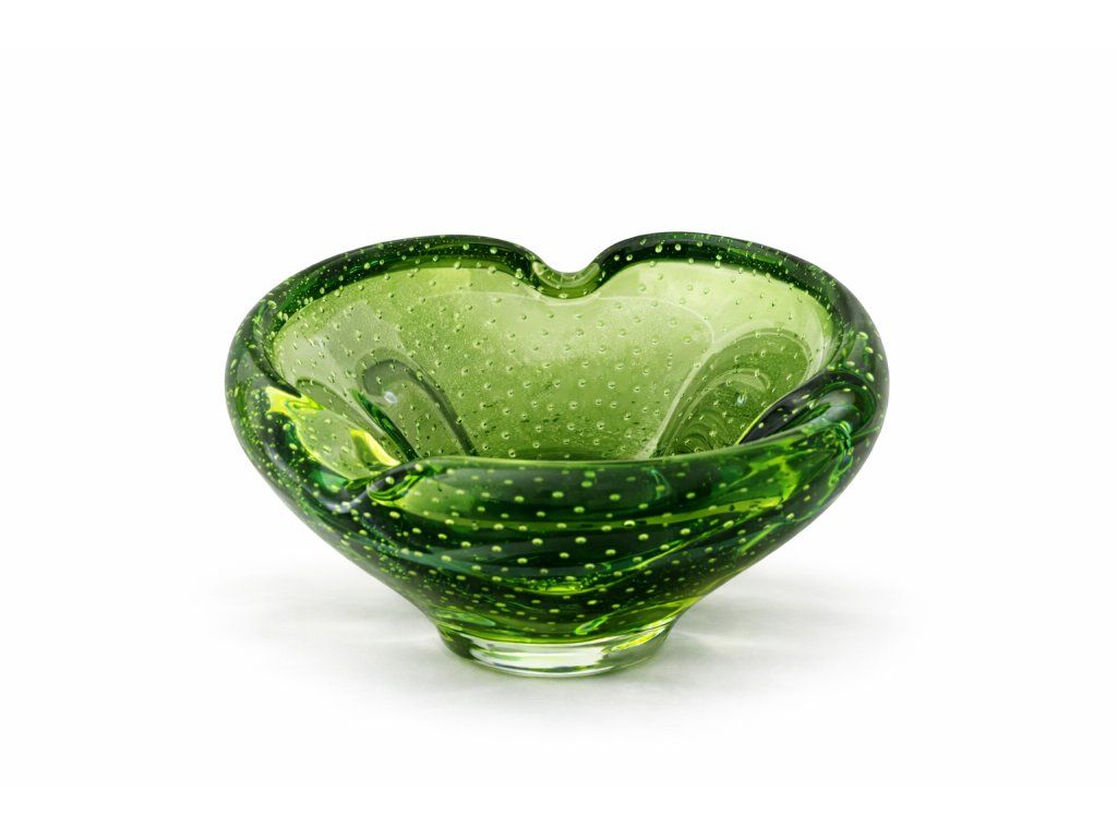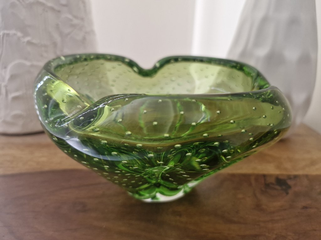 Krásná masivní mísa z hutního skla v krásné zelené barvě s dekorem řízených bublinek. Autor návrhu pravděpodobně František Zemek, sklárna Mstišov, 60. léta 20. století. Výška 9 cm, průměr 17 cm. Top vitrínový stav.