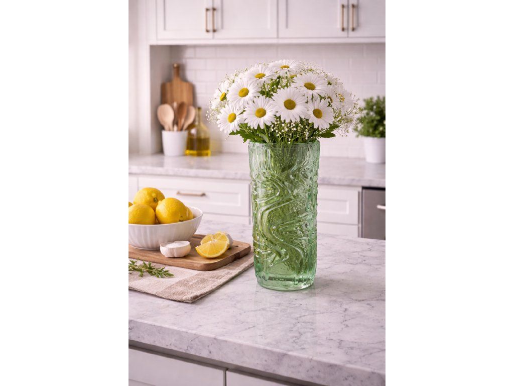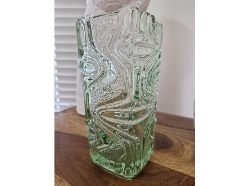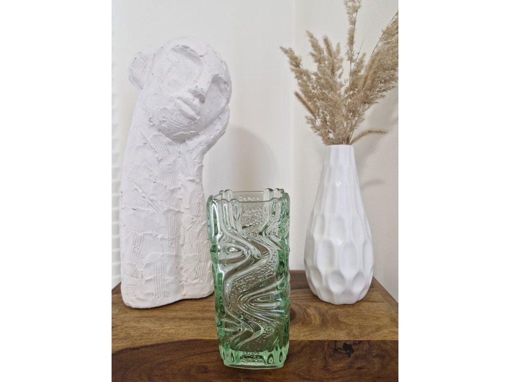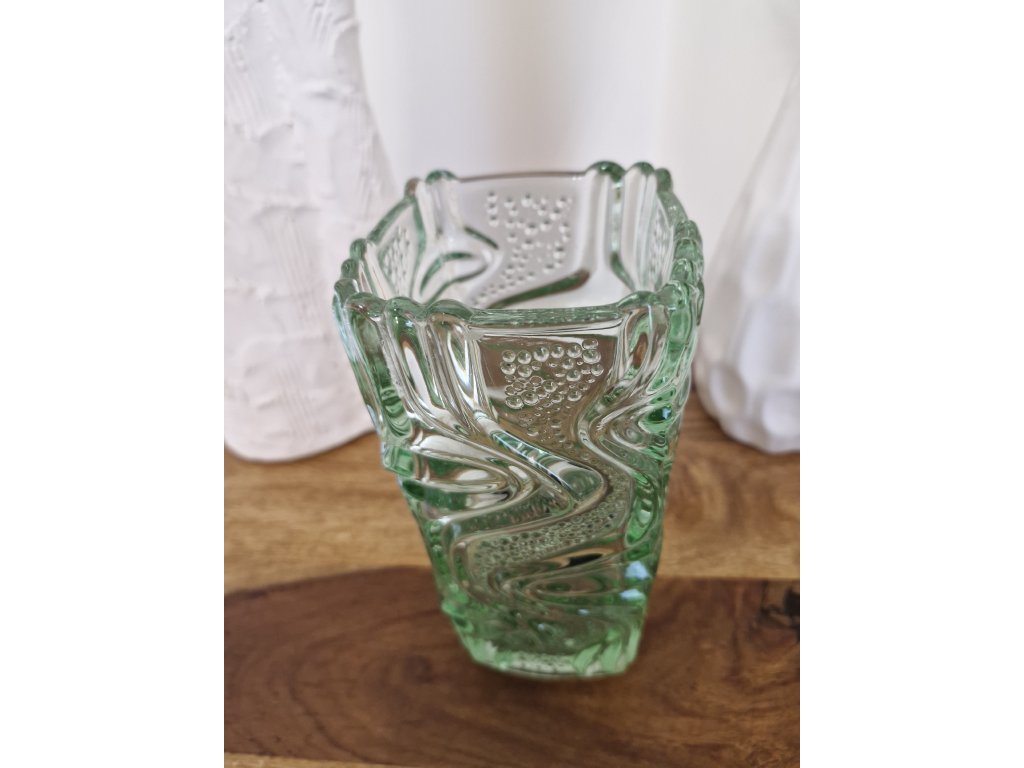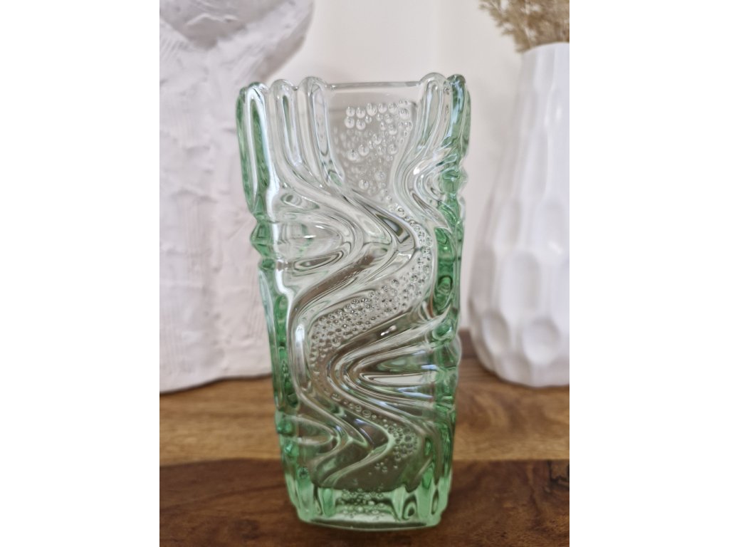 Krásná váza z lisovaného skla v jemné zelené barvě. Autor návrhu František Pečený, sklárna Heřmanova huť, r. 1974. Výška 18 cm. Top stav.