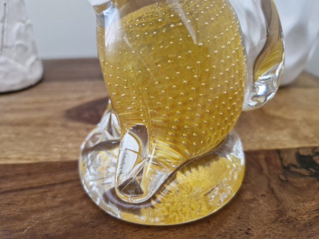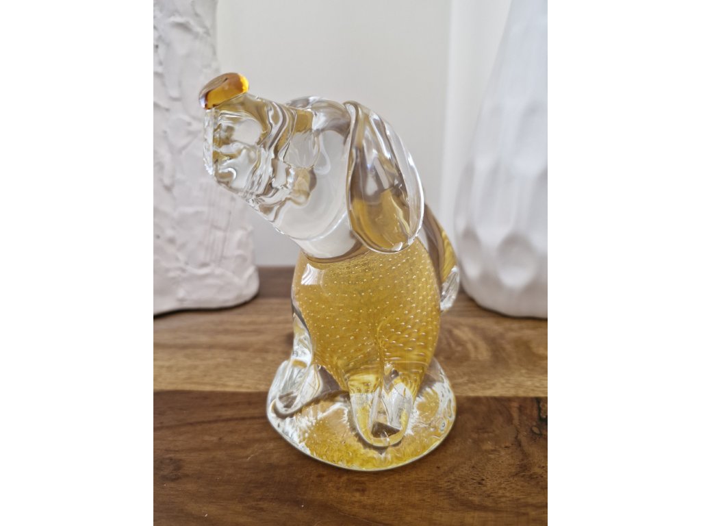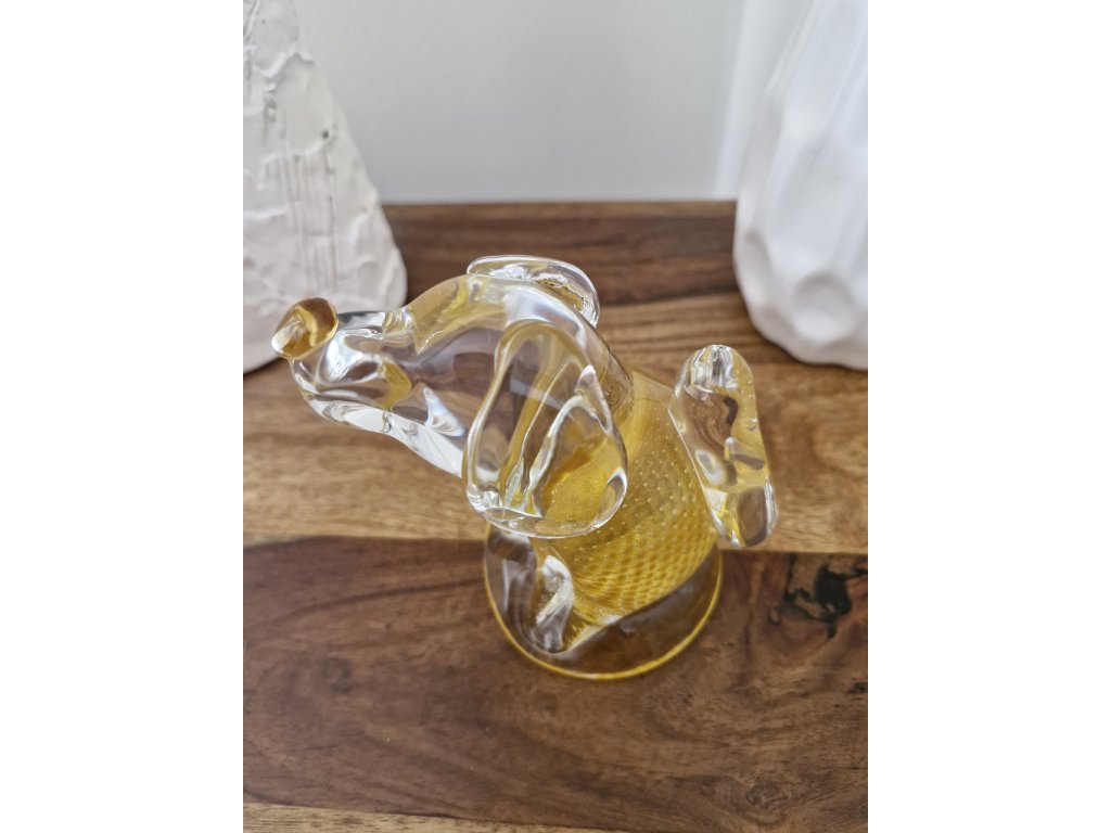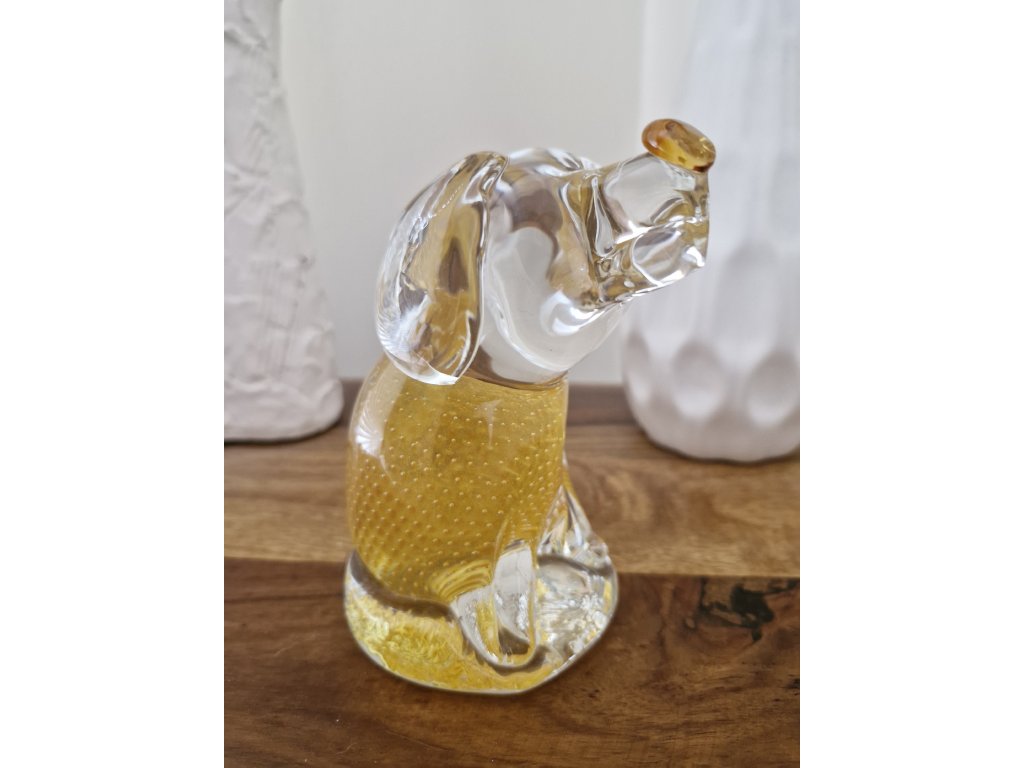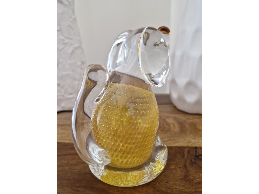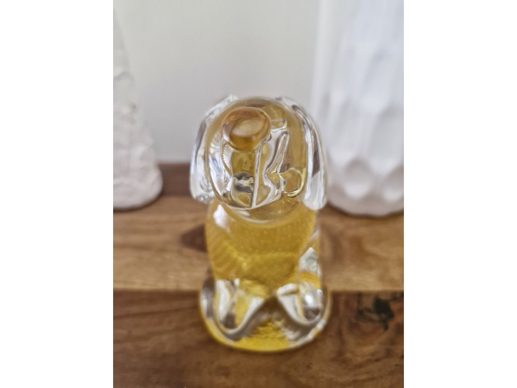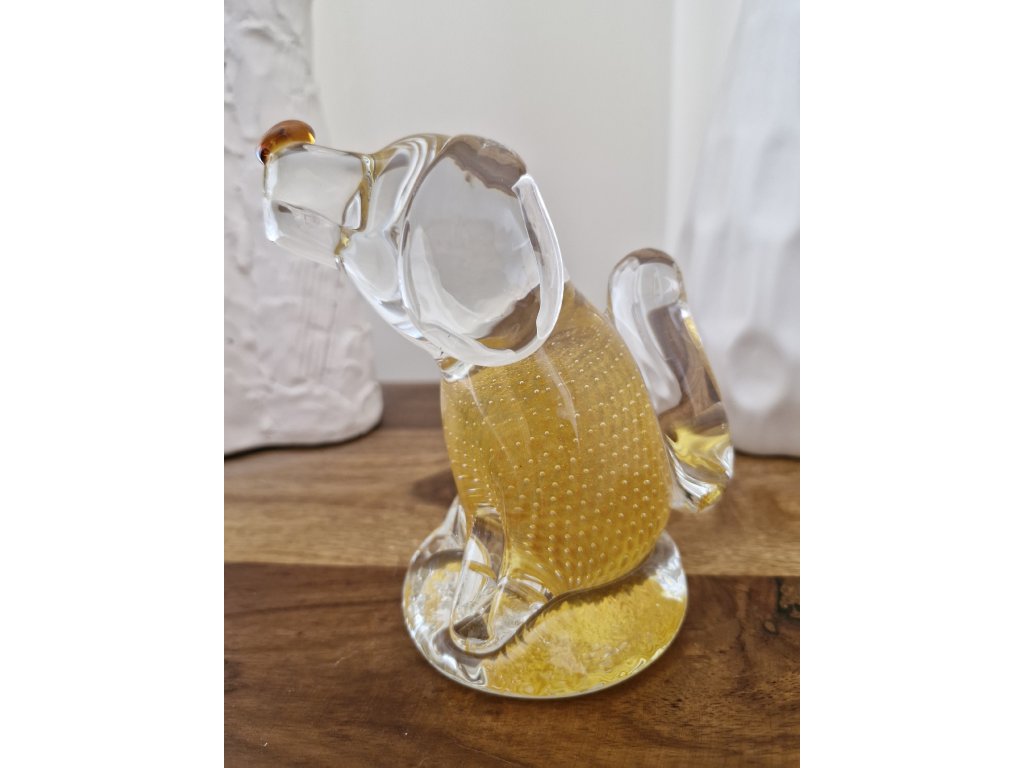 Krásný žlutý pejsek z foukaného skla s dekorem řízených bublinek z produkce sklárny Art Glass PRINC. Byl vyroben pouze v malém nákladu při příležitosti jubilea kapely Žlutý pes a jejich písně Sametová. Výška 13 cm. Top stav.